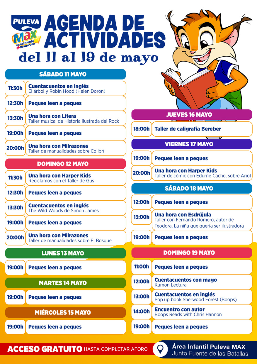 Estas sesiones tendrán lugar en el ‘Área Infantil Puleva Max’ durante toda la Feria del Libro. De lunes a viernes se realizará una única sesión a las 19.00h y los fines de semana se duplicarán en dos turnos, uno a las 12.30h y otro a las 19.00h. Cada sesión contará con un aforo limitado, por lo que será necesario inscribirse previamente. Al finalizar, cada uno de los asistentes podrá disfrutar de una merienda saludable con todo el sabor de Puleva Max cacao con cereales.